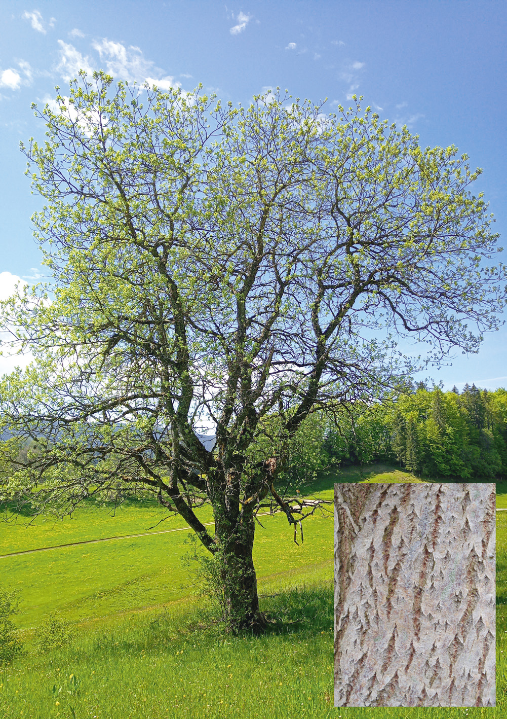 Der Baum erreicht auf durchlässigen Böden und guter Lichtversorgung Wuchshöhen bis über 10 m (Abb. 5). Die grau- bis schwarzbraune Rinde ist im Austrieb flaumig behaart und hat rautenförmige Lentizellen (Korkporen), die im Alter rissig aufspringen und der Art ihre charakteristische Rindenstruktur verleihen (Abb. 6).