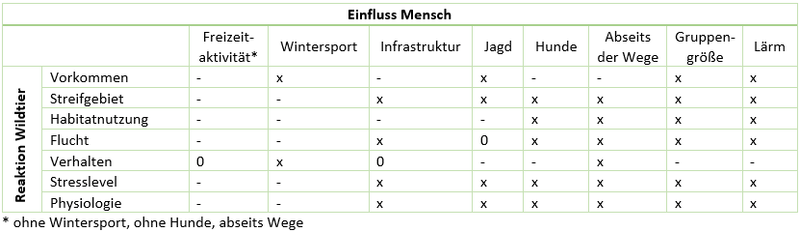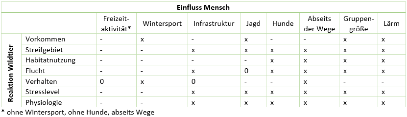 Tab. 1: Die Tabelle zeigt Aktivitäten des Menschen (Zeile oben), die eine Reaktion bei Wildtieren hervorrufen (linke Spalte). Negatives Vorzeichen (-): negativer Effekt der menschlichen Aktivität auf Wildtiere, kein Effekt: 0, keine Angabe: x. Keine der Studien konnte eine positive Reaktion von Wildtieren auf menschlichen Einfluss belegen. Der Faktor Physiologie beinhaltet Reproduktionsrate, Geschlechterverhältnis und Fitness.