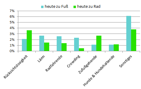 Blicken die Befragten in die Vergangenheit ihrer Erfahrungen mit Waldbesuchen, dann vervierfachen sich die entsprechenden Nennungen. Fühlen sich am Befragungstag 2,6% der Radfahrenden durch Zufußgehende gestört, so waren es entsprechend der eigenen Erinnerung in die Vergangenheit 10,9%. Ähnlich verhält es sich beim Störungsempfinden der Zufußgehenden gegenüber den Radfahrenden: der Wert klettert von 2,7% (heute) auf 11,2% (in der Vergangenheit). Eine Störung durch Hunde und deren Besitzenden haben beide Gruppen am Erhebungstag gleich stark empfunden – auch hier liegen die Werte bei der Betrachtung der Vergangenheit deutlich höher, unter den Zufußgehenden kommt es sogar zu einer Vervierfachung der Nennungen. Lediglich auf die Störungen durch "Crowding" reagieren beide Gruppen ähnlich, die Werte liegen sowohl in der Vergangenheit als auch bei der Momentaufnahme bei 2% – wobei die Wandernden etwas sensibler sind.