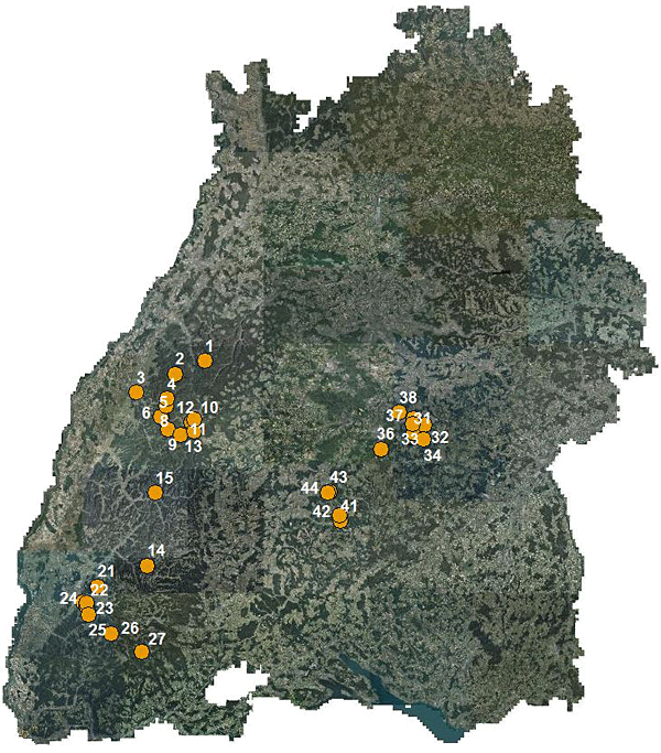 Abb. 2: Erhebungspunkte (Hintergrundkarte: DOP_gesamt_oo, Freigegeben unter AZ: 2851.9-1/3 Landesamt für Geoinformation und Landesentwicklung BW (www.lgl-bw.de))
