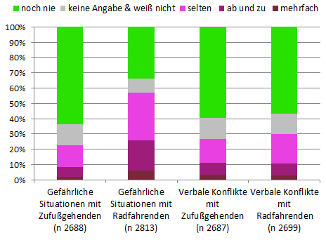 Bei den verbalen Konflikten stellt sich das Bild etwas anders dar, knapp 60% der Teilnehmenden sind weder mit Zufußgehenden noch mit Radfahrenden jemals in Streit geraten. Jeweils 8% haben das schon mehrfach erlebt.