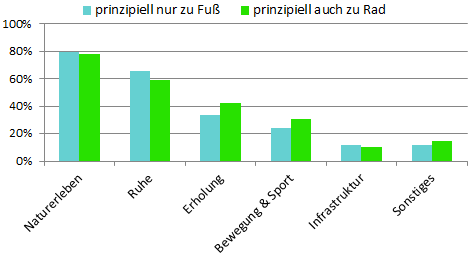 Die Bedeutung einzelner Motive weist dabei teilweise signifikante Unterschiede auf: "Sport und Bewegung" und "Erholung" sind für Menschen, die prinzipiell auch zu Rad im Wald unterwegs sind, wichtiger als für Menschen, die prinzipiell nur zu Fuß gehen. Umgekehrt ist "Ruhe" für die Zufußgehenden von größerer Bedeutung. Prozentual sind diese Unterschiede allerdings relativ gering; die Rangfolge der Motive bleibt bei allen Gruppen gleich.