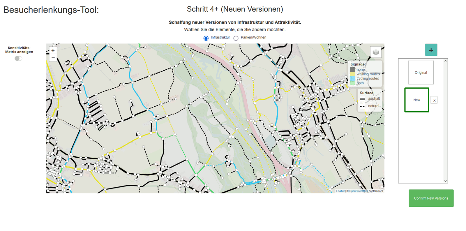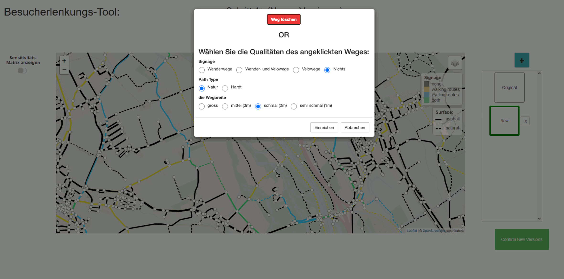 Diese Ansätze arbeiten im Hintergrund, weshalb die Benutzeroberfläche einfach gehalten werden konnte. so können auf einfache Weise in einem gewünschten Gebiet Besucherströme simuliert sowie ökologisch sensible Bereiche visualisiert werden. Über die benutzerfreundliche Oberfläche können Wege und Infrastrukturen angepasst und deren Auswirkungen auf Nutzungen und Schutzgebiete in Echtzeit analysiert werden. Das Tool wurde speziell für eine effiziente und praxisnahe Planung entwickelt.