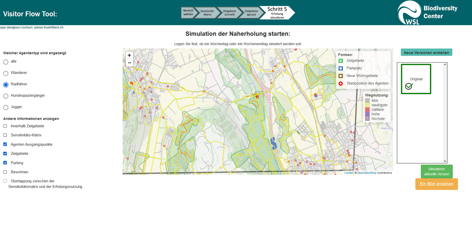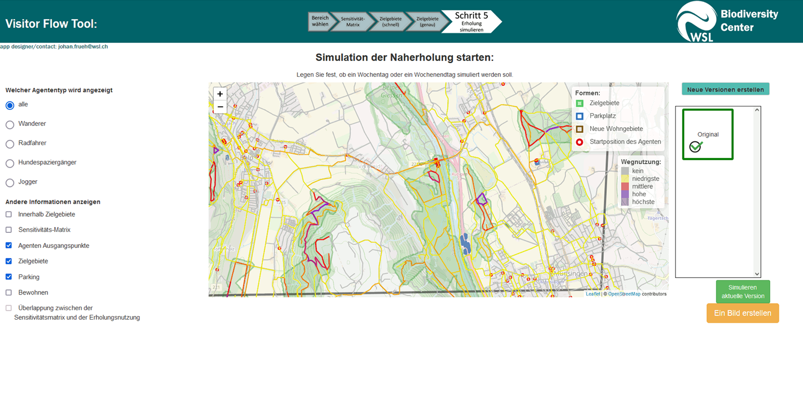 Das Besucherlenkungstool ermöglicht es, in wenigen Schritten für ein beliebiges Gebiet in den periurbanen Regionen der Schweiz die Auswirkungen verschiedener Wegeplanungsszenarien auf die Erholungsnutzung und den Naturschutz zu simulieren:
