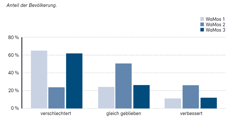 Wird wegen übergeordneter Interessen, wie Autobahnen oder andere Infrastrukturprojekte, eine Rodung bewilligt, ist in der Regel in der Nähe eine gleich grosse Waldfläche neu anzupflanzen. In WaMos 2 wie auch WaMos 3 befürwortet die überwiegende Mehrheit der Befragten diesen Realersatz. Nur eine kleine Minderheit ist der Ansicht, es brauche keinen Ersatz; ihr Anteil ist jedoch gegenüber dem Jahr 2010 signifikant gesunken.
