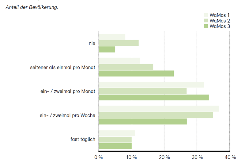 Die Häufigkeit der Waldbesuche in der Schweizer Bevölkerung ist seit 1978 (einer den WaMos-Erhebungen vorausgehende Befragung) im Mittel etwa konstant geblieben. Es gab aber Veränderungen bei der Häufigkeit. Der Anteil von Personen, die den Wald nie besuchen, ist 2020 auf einen Tiefststand gesunken (4,9 %). Aber auch der Anteil derjenigen, die den Wald nur 1–2 mal pro Woche aufsuchen ist seit 1997 stetig zurückgegangen (28,8 % in 2020). Grösser geworden ist dagegen die Gruppe derjenigen, die 1–2 mal pro Monat oder seltener in den Wald gehen (22,8 %). Die Frequenz der täglichen Waldbesuche wiederum hat sich über alle vier Beobachtungszeitpunkte kaum verändert (9,9 %).