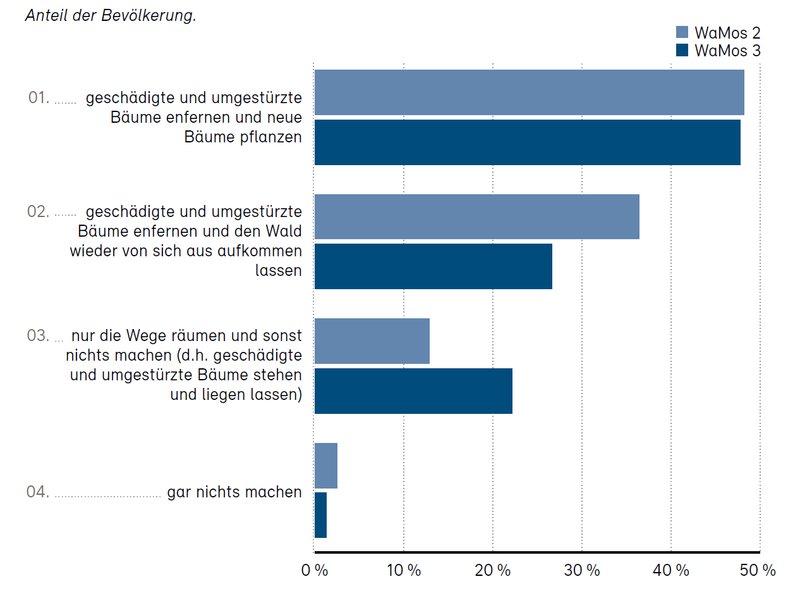 Fast die Hälfte der Befragten denkt, geschädigte oder umgestürzte Bäume sollten entfernt und an ihrer Stelle neue angepflanzt werden – eine ähnliche Haltung wie 2010. Signifikant gestiegen ist der Anteil derjenigen, die nur die Wege geräumt haben möchten und sich gegen weitere Massnahmen aussprechen.