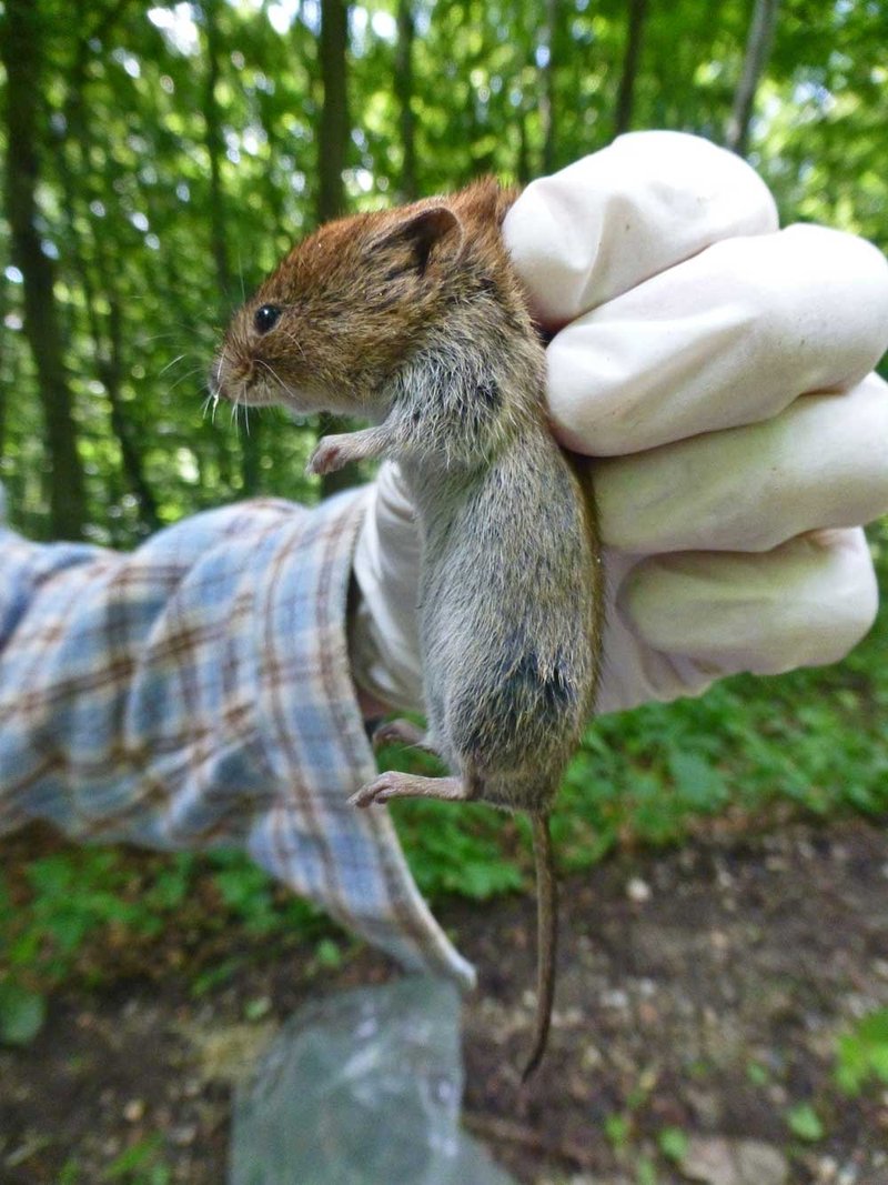 Abb. 1: Am Schlafittchen gepackt, Rötelmaus wird für die Hantavirus -Probenahme vorbereitet (Foto Dr. Hendrik Turni).