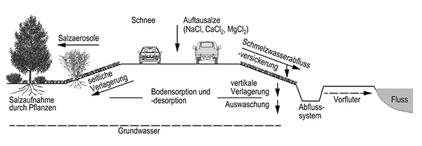Abb. 3. Wege der Auftausalze in der Umwelt: Die mechanisch ausgetragenen Auftausalze gelangen auf verschiedenen Wegen in die Umwelt und beeinträchtigen damit Pflanzen, Böden und Wasser. Quelle: aus Brod, H.G. 1993