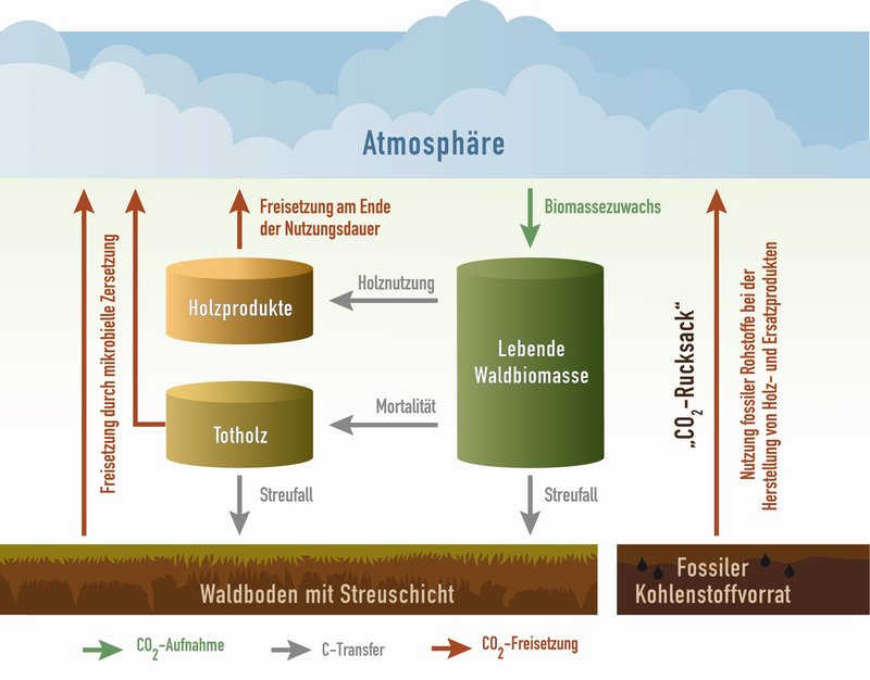 Der Wald nimmt im Zuge der Photosynthese CO2 aus der Atmosphäre auf und speichert den Kohlenstoff im Holz. Diesem Zuwachs an Holzsubstanz steht jedoch ein Abgang gegenüber, der sich aus geplanten Nutzungen sowie kalamitäts- und konkurrenzbedingter Mortalität zusammensetzt. Übersteigt der Zuwachs den Abgang, so wird der Holzvorrat im Wald vergrößert, ist der Zuwachs kleiner als der Abgang, dann wird der Holzvorrat geringer. Den größten Anteil am Abgang machen im bewirtschafteten Wald im Normalfall die geplanten Nutzungen aus.