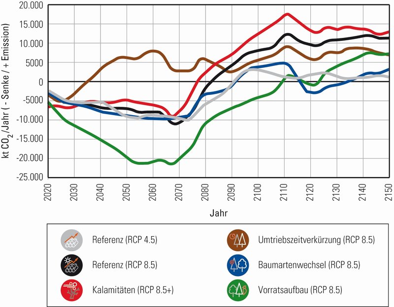 Im Projekt CareforParis wurden alle drei Wirkungen untersucht: Wald, Holzprodukte und vermiedene Emissionen. Interessant ist, dass in allen Szenarien mit marktorientierter Waldnutzung die vermiedenen Emissionen den größten Klimaschutzeffekt haben. Wichtig ist auch, dass der Wald in allen Szenarien bis zum Jahr 2150 von einer Senke zu einer Quelle wird (Abbildung 2). Wie rasch bzw. wie stark das passiert, hängt vom Klima und der Art der Bewirtschaftung ab.