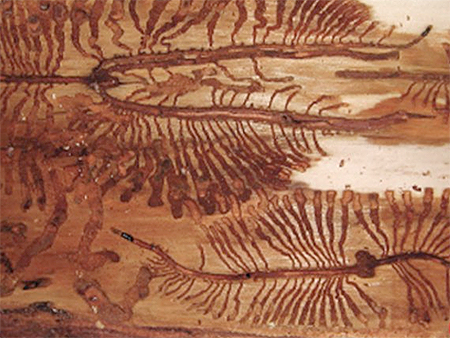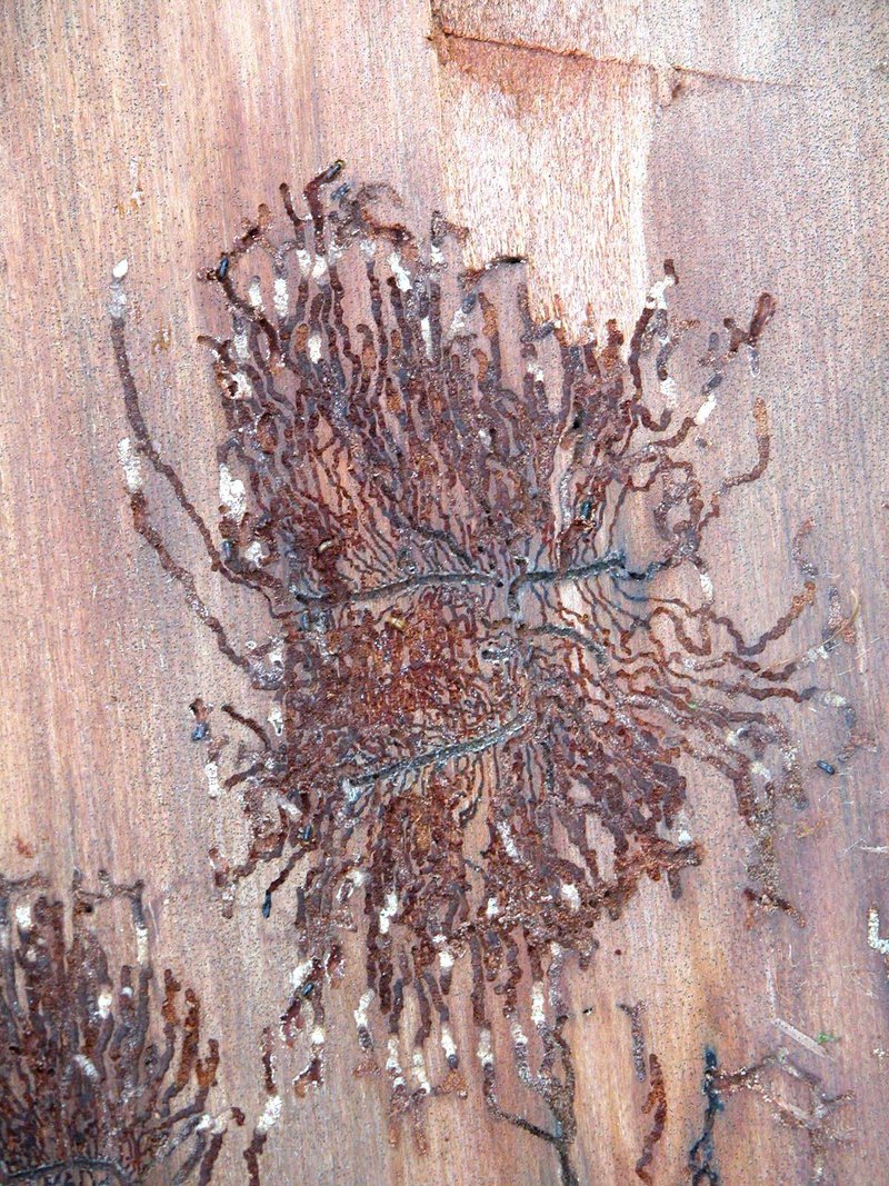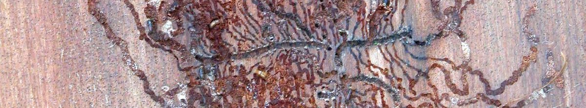 Entwicklung: Nachdem sich die Männchen erfolgreich mittels Einbohrloch durch die Rinde gebohrt haben, findet in der Rammelkammer die Begattung statt. Anschliessend legt das Weibchen von dort nach links und rechts je einen Muttergang an, in welchem die Eier abgelegt werden. Oft bohrt ein zweites Weibchen vom gleichen Einbohrloch aus einen zusätzlichen, zweiarmigen Muttergang. Dieser Vorgang führt dann zum arttypischen, doppelkammerförmigen ("liegendes H") Brutbild (s. Abb. 3).