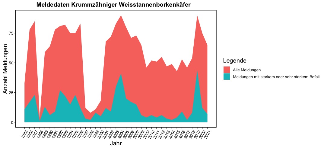 Aufgrund von Beobachtungen und Untersuchungen der vergangenen Jahre ist davon auszugehen, dass Massenvermehrungen des Krummzähnigen Weisstannenborkenkäfers vor allem durch Trockenperioden begünstigt werden. Die Entwicklung der Käferpopulation im Zusammenhang mit Trockenperioden spiegelt sich u.a. auch in der Statistik von Waldschutz Schweiz (Abb. 4) wider. Dort zeigt sich, dass die heiss-trockenen Sommer 2003 und 2018 einen deutlichen Anstieg der Meldungen mit starkem oder sehr starkem Befall verursacht haben.