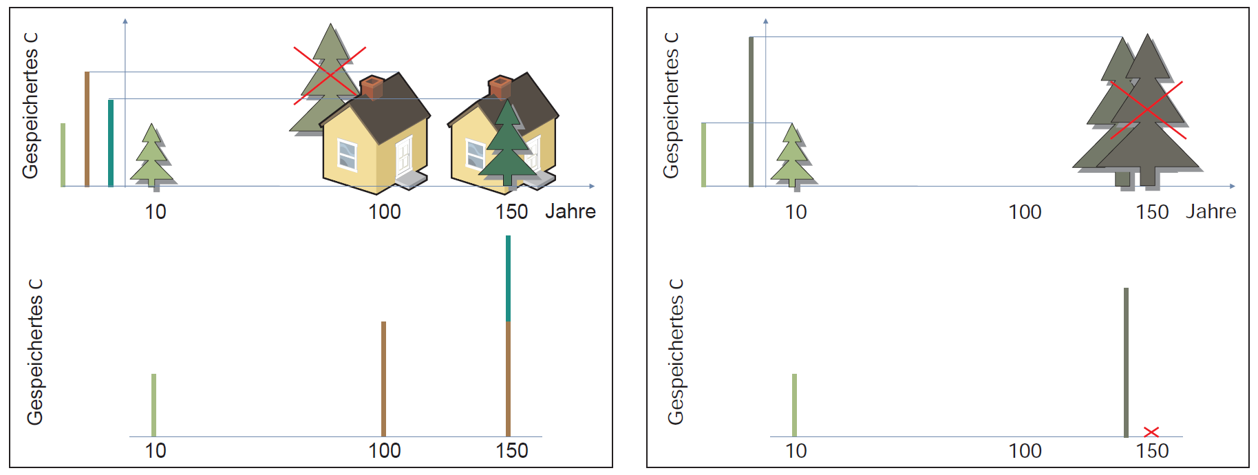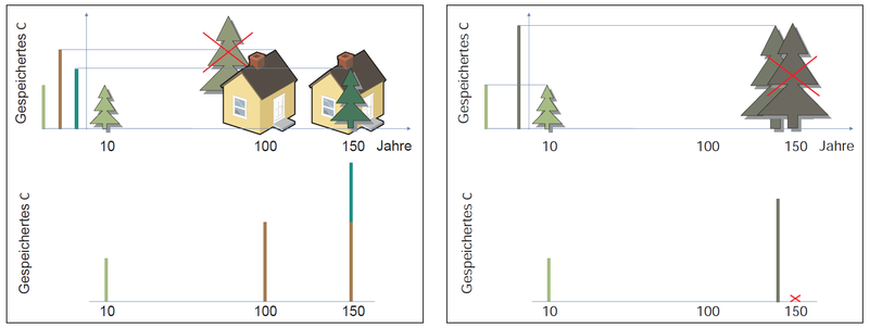 Wird Holz geschlagen und verbaut, so hält es den über seine Lebensdauer angehäuften Kohlenstoff gebunden. In der Schweiz sind rund 110 Mio. m3 Holz in Gebäuden und Holzprodukten verbaut. Dieser Holzvorrat entspricht rund 100 Mio. t CO2. Rund drei Viertel dieses Holzes sind zur Konstruktion und zum Ausbau von Gebäuden genutzt. Zum einen verlängert sich damit die Zeit, in der das CO2 gebunden bleibt. Wird zum Beispiel ein Baum mit einer natürlichen Lebensdauer von rund 150 Jahren nach 100 Jahren gefällt und weitere 100 Jahre als Dachbalken genutzt, verlängert sich die Verweildauer des gebundenen Kohlenstoffs um 50 Jahre. Sobald der Baum geschlagen ist, wachsen ausserdem gleich junge Bäume nach, die weiteres CO2 binden und nach rund 100 Jahren wieder hiebreif sind (Abb. 3).