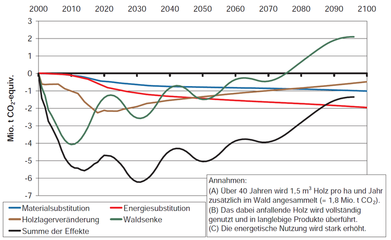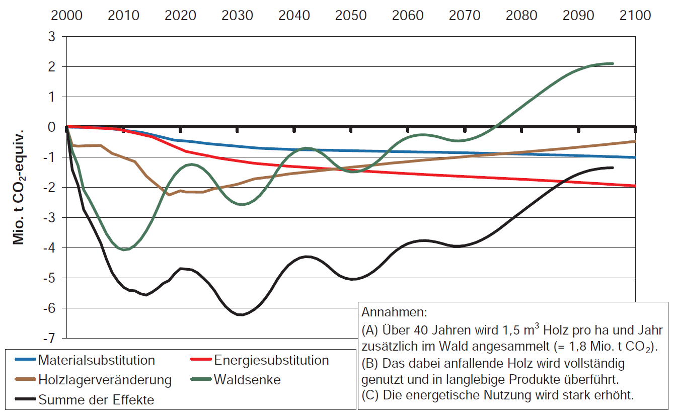 Im Sinne eines nachhaltigen Klimaschutzes ist die Nutzung des Holzes weitaus sinnvoller als die möglichst starke Steigerung der Holzvorräte im Wald. Zum heutigen Zeitpunkt kann eine Erhöhung des Holzvorrats von bis zu 1,8 Mio. t CO2/Jahr bei den Kyoto-Verpflichtungen angerechnet werden. Dagegen wird die Klimawirksamkeit von Holzprodukten durch die Konservierung des Kohlenstoffs im Holz in den Kyoto-Verpflichtungen nicht berücksichtigt. Und auch die Substitutionsleistungen, die langfristig noch wirksamer sind, fallen nur indirekt – über eine verringerte Nutzung von fossilen Energieträgern – in die Waagschale.