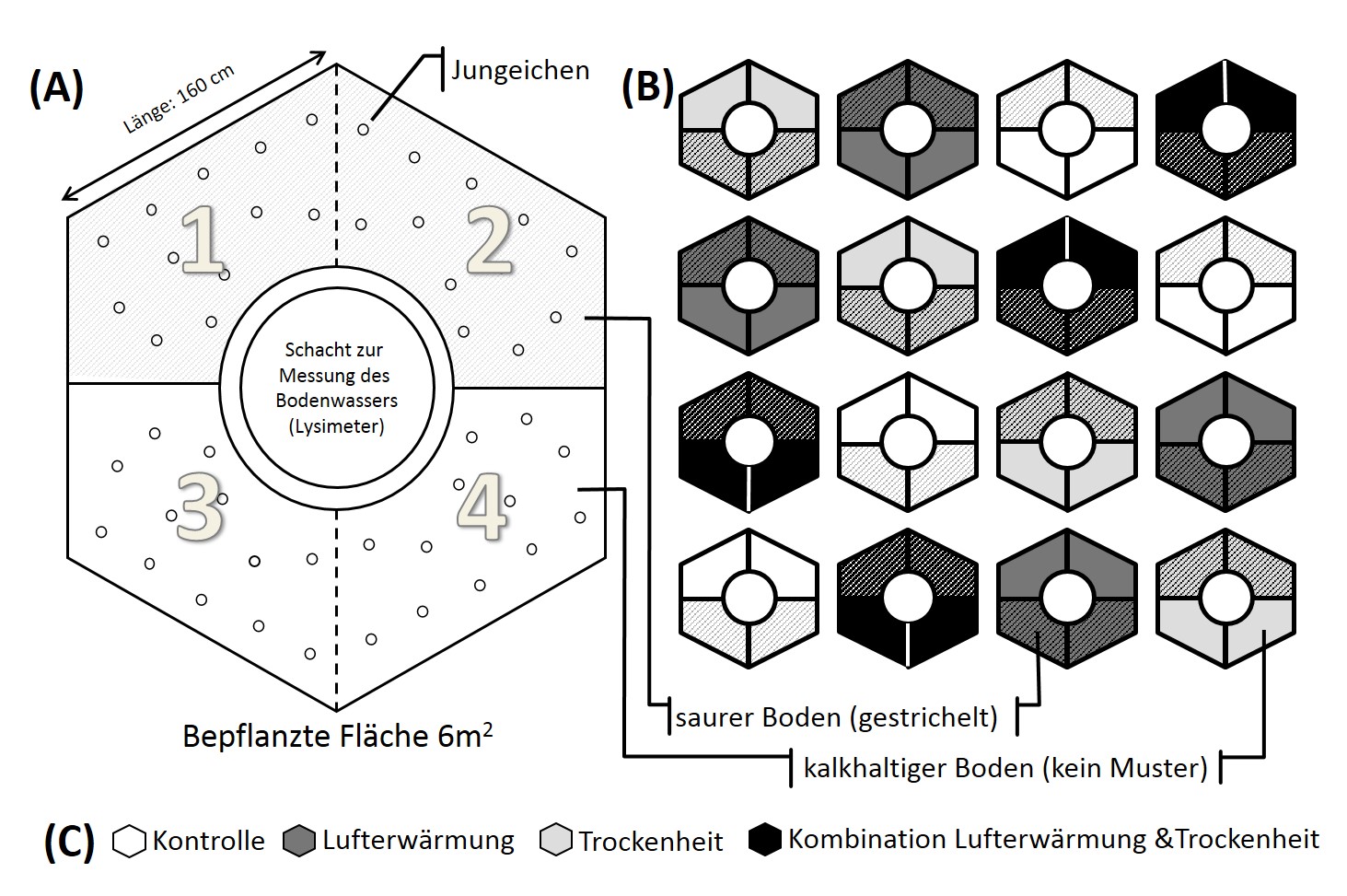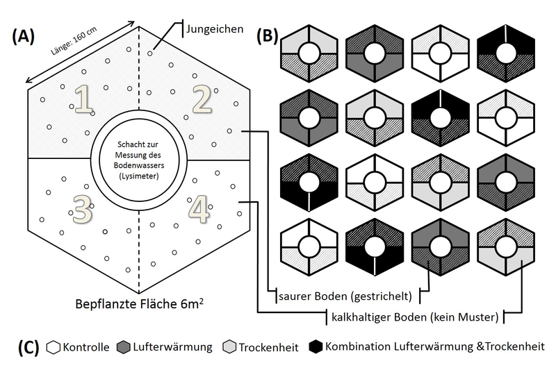 Abb. 3 - Schema der Behandlungsvarianten (C) in den Modellökosystemkammern (B). In jedem Viertel der sechseckigen Kammern wurden zwölf zweijährige Jungeichen (je 4 Herkünfte von 3 Eichenarten) in zufälliger Anordnung gepflanzt (A).