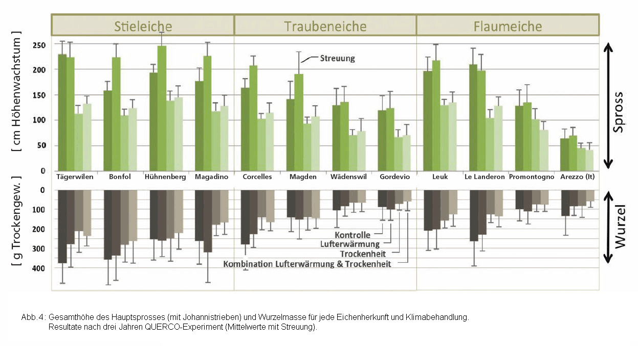 Bereits innerhalb der Kontrollgruppe (keine Behandlung) zeigten sich grosse Unterschiede im Wachstum der verschiedenen Provenienzen. Das Längenwachstum nach drei Jahren (2007 bis 2009) variierte sowohl innerhalb als auch zwischen den Arten stark. Während die Stieleichen aus Tägerwilen im Durchschnitt 230 cm wuchsen (± 53 cm Standardabweichung), erreichte die Provenienz aus Bonfol nur gerade 159 cm (± 36 cm). Auch bei der Flaumeiche wurden sehr grosse Unterschiede festgestellt: 210 cm (± 67 cm) für Le Landeron und 129 cm (± 67 cm) für die Herkunft Promotogno. Arezzo, die am südlichsten gelegene Herkunft, wies ein noch geringeres Wachstum auf. Der Durchmesserzuwachs der Stämme im dritten Jahr variierte bei den CH-Provenienzen zwischen 2,7 mm (Wädenswil) und 5,4 mm (Tägerwilen). Auch bei der Reaktion auf Trockenheit zeigten die zwölf Eichenherkünfte stark unterschiedliches Verhalten. So wurde z.B. das Höhenwachstum der Stieleichenherkunft Tägerwilen stark beeinträchtigt (Sprosslänge –46% gegenüber der Kontrolle), während bei der Stieleiche aus Hünenberg der Rückgang schwächer war (36%).