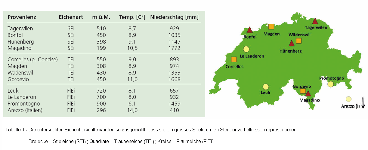 Dazu ernteten die Forschenden im Herbst 2003 zuerst Eicheln von je vier autochthonen Stiel-, Trauben- und Flaumeichen-Provenienzen (Tabelle 1). Die im Versuchsgarten der WSL angezogenen Pflanzen pflanzten sie dann im Frühling 2006 als zweijährige Jungeichen in 16 Modellökosystemkammern auf zwei verschiedenen Bodentypen. Ein Bodentyp stammte aus Eichenbeständen auf basischer Unterlage (pH 7) in Brugg (AG), der andere von Eichenbeständen auf saurem Untergrund (pH 4) in Eiken (AG).