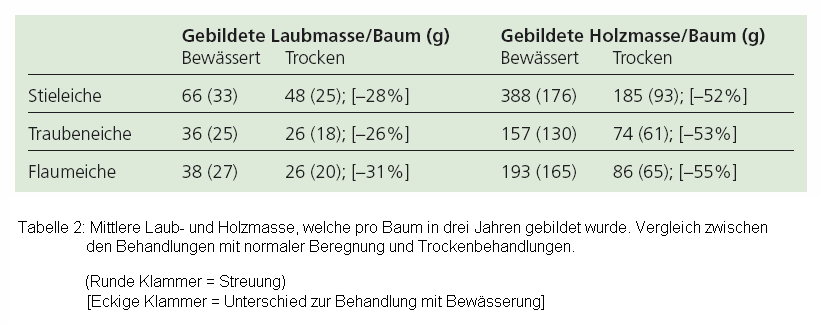 Ganz deutlich bremste die Trockenheit das Wachstum: Sprosslänge und Stammdurchmesser nahmen um 40% bzw. 23% ab, und auch die Holzmasse verringerte sich im Durchschnitt um gut die Hälfte (Tabelle 2). Die Wurzelmasse bildete sich durchschnittlich um 30% zurück. Der Vergleich zwischen den Kontrollbehandlungen und den Behandlungen mit Trockenheit zeigte für alle Provenienzen eine deutliche Abnahme der gebildeten Laubmasse um rund 28%. Alle Arten erlitten durch den Trockenstress statistisch gesehen eine ähnliche Reduktion ihrer Biomassenleistung (Blattwerk-, Holz- und Wurzelbildung).