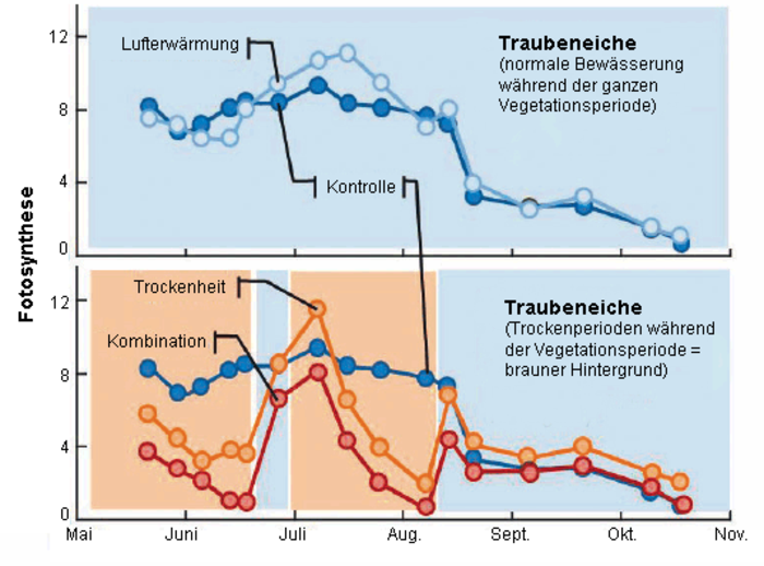 Dieser Einbruch ist auf das Schliessen der Spaltöffnungen (Stomata, Abb. 3) auf der Unterseite der Eichenblätter zurückzuführen, was dem unkontrollierten Wasserverlust durch Verdunstung und somit dem Austrocknen der Pflanze vorbeugt. Gleichzeitig hemmt dies aber auch die CO2-Aufnahme und damit die Fotosynthese. Bei den Eichen beobachteten die Forscher, dass sich die Spaltöffnungen bei Lufterwärmung stärker öffneten als bei normaler Temperatur, während Trockenheit wie oben beschrieben zum Verschluss der Stomata führte.