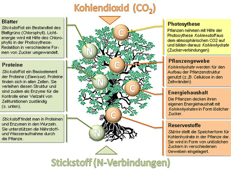 Stickstoff ist ein wichtiges Bauelement von Lebewesen, das insbesondere für die Bildung von Eiweissstoffen und der Erbsubstanz benötigt wird. Stickstoff findet sich zwar in grossen Mengen in der Luft (N2), die Pflanzen nehmen ihn aber zu mehr als 90% über den Boden und das Wurzelwerk in Form von Nitrat und Ammonium auf (Abb. 4). Diese beiden Stickstoffverbindungen werden von Bodenorganismen wie Pilzen und Bakterien hergestellt, welche in der Lage sind, organische Materie (z.B. Laub) zu zersetzen.