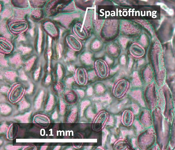 Abb. 3 - Eine wichtige Rolle bei der Bewältigung der Trockenheit spielen die Spaltöffnungen auf der Blattunterseite. Bei grosser Trockenheit werden sie geschlossen, um den Wasserverlust durch Verdunstung zu minimieren. Damit wird aber auch die Leistung der Fotosynthese vermindert.