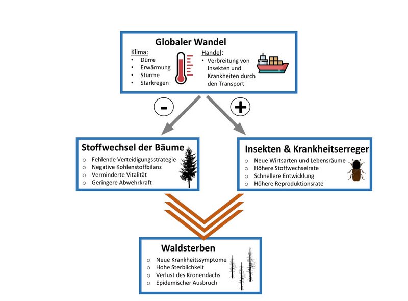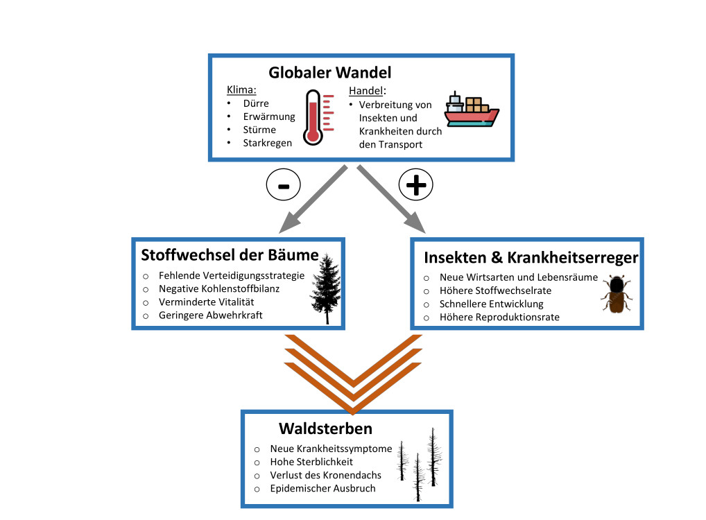 Abb. 2: Vielfältige Auswirkungen globaler Veränderungsprozesse auf den Stoffwechsel von Bäumen sowie die Entwicklung von Insekten und Krankheitserregern. Die verminderte Vitaltität der Bäume kollidiert mit der schnellen Entwicklung und Fortpflanzung von Insekten und Krankheitserregern. Dies führt zu Krankheiten und epidemischen Ausbrüchen in Wäldern. Grafik: Hartmann et al.