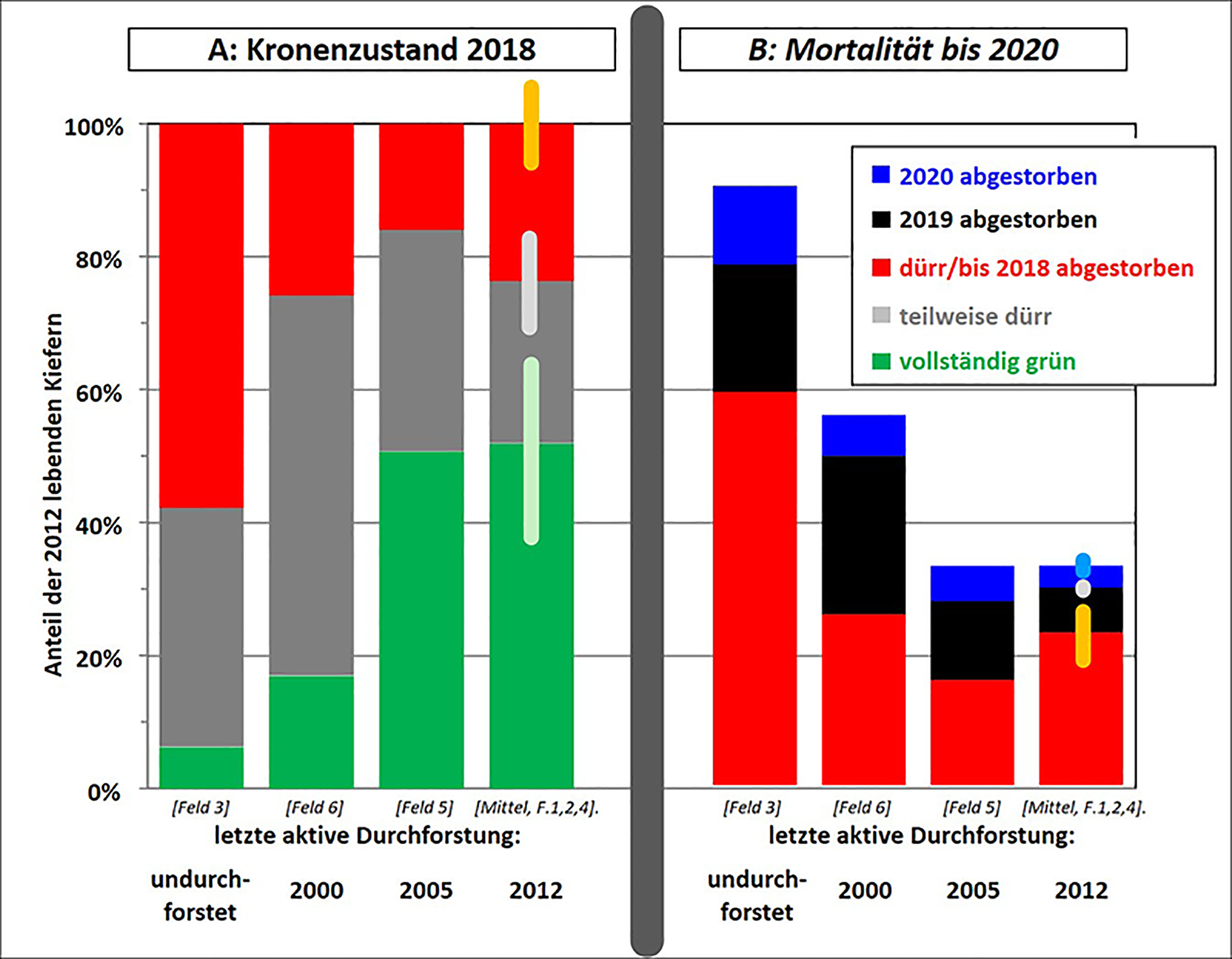 Die ungünstigste Entwicklung zeigt das Vergleichsfeld. Im April 2019 wiesen dort bereits knapp 60 % der sechs Jahre zuvor noch lebend angetroffenen Kiefern abgestorbene Kronen ohne grüne Nadeln auf. Die meisten davon waren mutmaßlich 2018 abgestorben. 36 % der Kiefern zeigten schon deutlich erkennbare Anteile verbraunter Nadeln. Bei lediglich 6 % schienen die Kronen noch vollständig grün (Abb. 4A). 2019 setzte sich das Absterben weiter fort. Der Zustand auf dem undurchforsteten Vergleichsfeld ist inzwischen verheerend und entspricht mit 72 % abgestorbener Kiefern (Abb. 4B) etwa dem Niveau auf der benachbarten Schadflächen im Gemeindewald. Auch in den durchforsteten Beständen sind nennenswerte Schäden aufgetreten, aber durchweg mit weniger schlimmem Verlauf. Bemerkenswert war, dass sich im April 2019 auf dem Durchforstungsfeld, bei dem die letzte Durchforstung 18 Jahre zurück lag, die vergleichsweise ungünstigsten Verhältnisse zeigten. Es deutet sich an, dass der Kronenzustand umso günstiger ausfällt, je kürzer die letzte Durchforstung zurückliegt (Abb. 4A). Im Lauf von 2019 hat sich auch der Zustand der durchforsteten Bestände weiter verschlechtert (Abb. 4B) und mit 10 bis 39 % ein hohes Niveau abgestorbener Kiefern erreicht. Die Tendenz eines mit abnehmender Zeitspanne seit der letzten Durchforstung abnehmenden Schadensniveaus blieb aber erhalten.