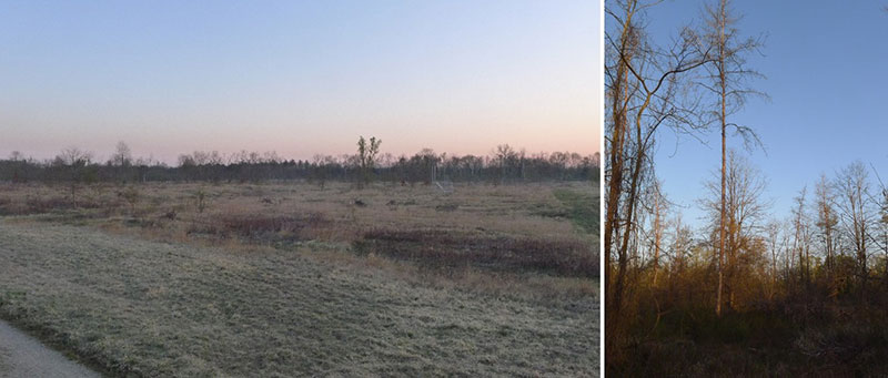 Abb. 3: Eindrücke von der Schadfläche im Kiefernwald der Gemeinde Hartheim am Rhein; geräumte Schadfläche (links), unmittelbar an den Versuch Kie120 angrenzender abgestorbener Bestand (rechts)