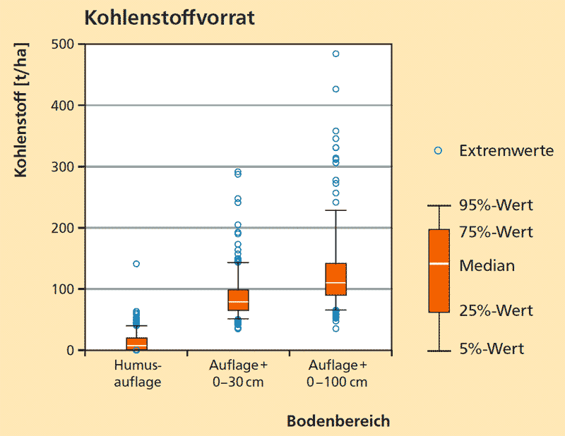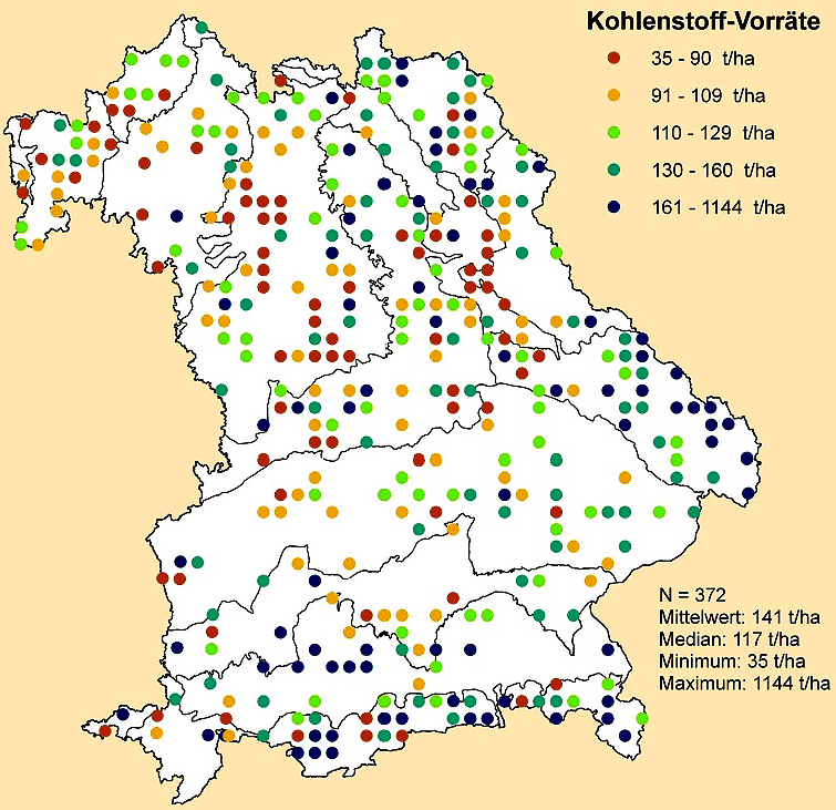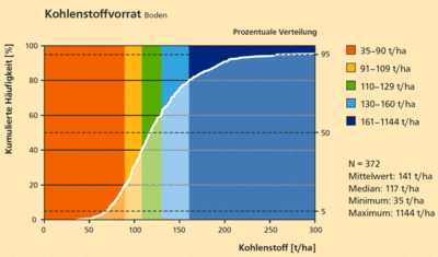 Sehr flachgründige und sehr steinige Böden haben trotz hoher Kohlenstoffgehalte generell sehr geringe Vorräte organischen Kohlenstoffs. Extrem hohe Vorräte finden sich an Punkten ohne oder mit sehr geringem Mineralbodenanteil, in der Regel Moore und Anmoore.