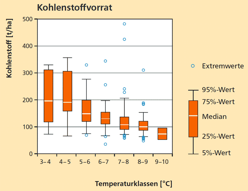 Die Temperaturspanne der Waldstandorte Bayerns reicht von 3,0 °C bis 9,0 °C, wobei drei Viertel aller BZE-Punkte zwischen 7,0 °C und 9,0 °C liegen. Die Kohlenstoffvorräte nehmen von den kalten hin zu den warmen Temperaturklassen ab (Abb. 3).