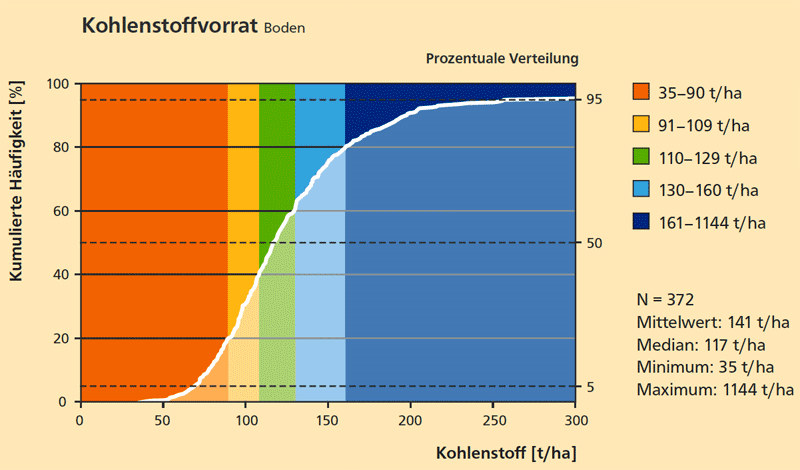 Der Kohlenstoff liegt in Böden in karbonatischer (Kalk-Dolomit-Gesteine und -Mergel) und organisch gebundener (Humus) Form vor. Beim Humus ist zwischen Nährhumus und Dauerhumus zu unterscheiden (vgl. Kasten). Die beiden Kohlenstoffbindungsformen wurden im Rahmen der zweiten Bodenzustandserhebung (BZE 2) analytisch bestimmt. In Abbildung 1 sind die BZE-Punkte mit ihren Vorratssummen des organischen Kohlenstoffs bis 150 Zentimeter Tiefe in Form einer Summenkurve dargestellt. Der niedrigste Wert aller BZE-Punkte liegt bei 35, der höchste bei 1.144 Tonnen pro Hektar (t/ha). Der 50-Prozent-Wert (Median) liegt bei 117 t/ha. Es gibt in Bayern keinen BZE-Punkt ohne Humus.