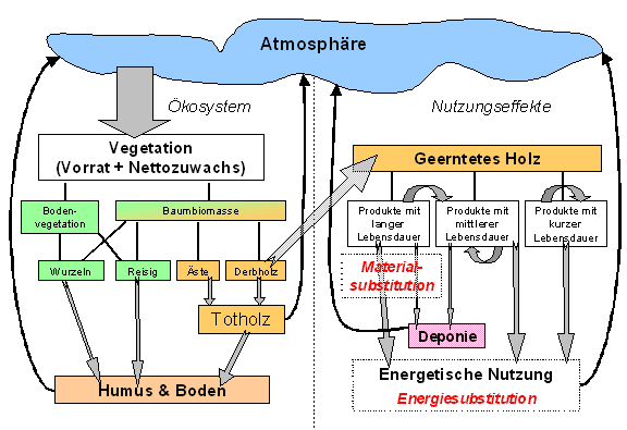 Die im Kyoto-Folgeprozess (Bonn, Marrakesch, Mailand) geschaffenen Möglichkeiten, durch Waldbewirtschaftung und Aufforstung zur Erfüllung von Emissionsreduktionsverpflichtungen beizutragen, beziehen sich ausschließlich auf den im Ökosystem gespeicherten Kohlenstoff. Bei der Berichterstattung wird nicht berücksichtigt, welche Ursache eine eventuelle Vorratsreduktion verursacht hat, bzw. wohin der Kohlenstoff geflossen ist.