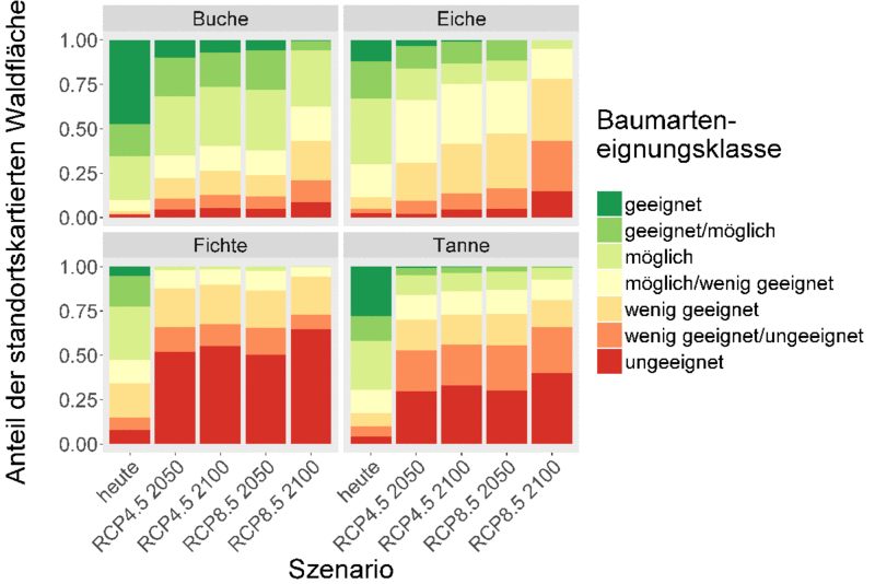 Diese Folgerungen ergeben sich für das RCP-Szenario 8.5 mehr als deutlich – dessen Eintreten bei Beibehaltung der aktuellen Entwicklungen leider eher wahrscheinlich ist. Realistischer Weise sind auch unter Szenario 4.5 entsprechende Folgen zu erwarten, wenn auch in leicht abgeschwächter Form. Insbesondere die Buche fände dann noch etwas günstigere Bedingungen vor. Ergebnis aller Szenarien ist allerdings, dass die baden-württembergischen Charakterbaumarten Buche und Tanne in bewirtschafteten Wäldern gegen Ende des 21. Jahrhunderts keine so dominierende Rolle wie bislang mehr einnehmen können.