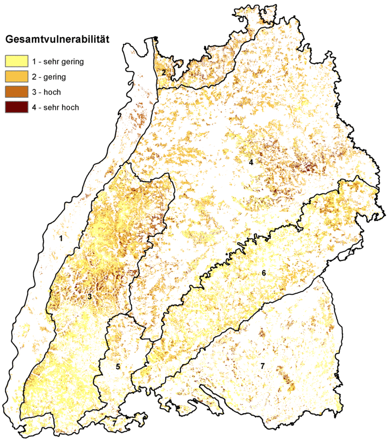 Die Vulnerabilitätskarte weist für die heutigen Bestände regionale Schwerpunkte mit besonders hoher Vulnerabilität im mittleren Schwarzwald, im nördlichen Oberrheingraben, im Odenwald sowie im Schwäbisch-Fränkischen Wald (in Wuchsgebiet 4) auf (Abb. 5). Zerstreut sind hohe Vulnerabilitäten auch auf der Schwäbischen Alb und im Südwestdeutschen Alpenvorland zu finden.