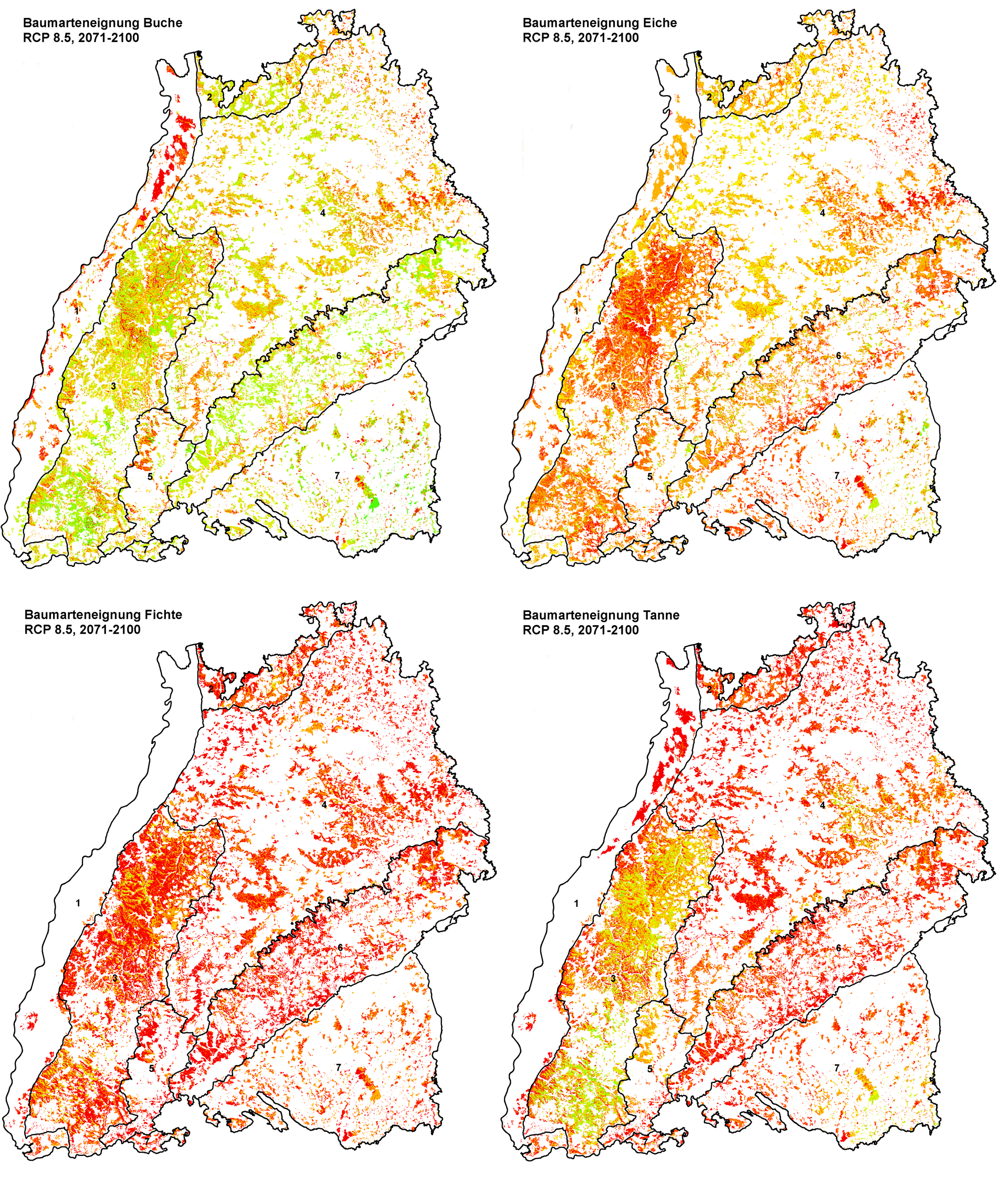 Betrachtet man die landesweiten Baumarteneignungskarten unter dem RCP-Szenario 8.5 für die ferne Zukunft (2071-2100), sind bei Buche zwar die mittleren Eignungsstufen (gelbliche und fahlgrüne Farbtöne) prägend (Abb. 3). Allerdings fallen bei näherer Betrachtung im Bereich Oberrheintal, Baar-Wutach, Schwäbisch-Fränkischer Wald und Teilen des Südwestdeutschen Alpenvorlands für die Buche ungeeignete (rote) Flächen auf. Für Eiche ungeeignete Flächen sind vor allem im Schwarzwald, dem Schwäbisch-Fränkischen Wald und an der Südostgrenze der Schwäbischen Alb lokalisiert.