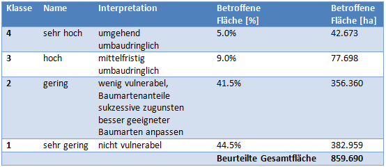 Wälder, die in die höchste Vulnerabilitätsklasse 4 eingestuft wurden, bilden prioritäre Ansatzpunkte für Anpassungsmaßnahmen an den Klimawandel. Hier kommen einer oder gleichzeitig mehrere Risikofaktoren so stark zum Tragen, dass die dort aktuell prägende Hauptbaumart als instabil bis hochgradig störungsanfällig einzustufen ist (Tab. 2). Dies trifft auf ca. 5% (rd. 42.000 ha) der beurteilten Waldfläche zu.