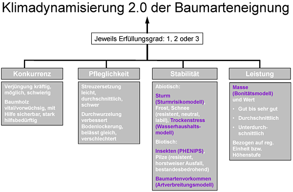Abb 2: Schema der dynamisierten Einschätzung der Baumarteneignung im Klimawandel. Farblich violett hervorgehobene Teilkriterien werden im weiterentwickleten Verfahren (2.0) nun klimadynamisch abgebildet. Alle anderen Teilkriterien entstammen dem bisher etablierten Verfahren zur Beurteilung der Baumarteneignung.