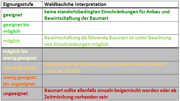 Ab der Eignungsstufe "möglich bis wenig geeignet" und schlechter wird die Verwendung einer Baumart als führende Baumart nicht mehr empfohlen. Die Bedeutungen der Hauptstufen sind mit der Modellversion 1.0 der Baumarteneignung aus dem Jahr 2010 identisch.