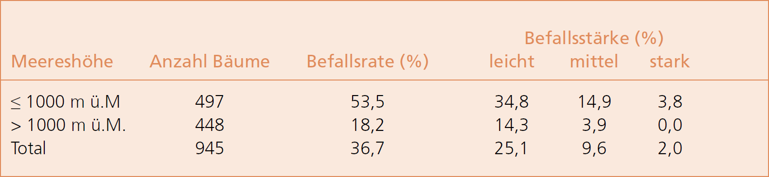 Jede dritte Föhre unterhalb 1600 m ü. M. ist mit Misteln bewachsen. Betrachtet man die einzelnen Föhren in unterschiedlichen Höhenstufen bezüglich Befallsrate und -intensität, so wird ersichtlich, dass in den tieferen Lagen nicht nur mehr Bäume Misteln aufweisen, sondern dass der Befall dort auch stärker ist. Unterhalb 1000 m ü. M. ist fast jeder fünfte Baum mittelstark bis stark befallen (Tab. 1).