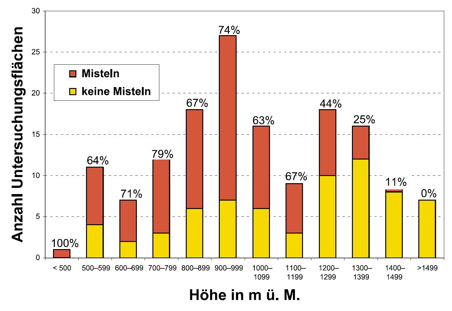 Abbildung 3 zeigt, dass bis zu einer Höhe von 1200 m ü. M. noch über 60% der Stichprobenflächen Misteln aufweisen. In höheren Lagen wird die Mistel seltener. So betragen die Anteile ab 1300 m ü. M. nur noch weniger als 30%. Die höchste Fundstelle liegt an einem Südhang auf knapp 1500 m Meereshöhe. Osthänge weisen am wenigsten Flächen mit Misteln auf. Ab einer Höhe von 1200 m ü. M. kommen die Halbparasiten fast ausschliesslich in den wärmegünstigen Süd- oder Westlagen vor.
