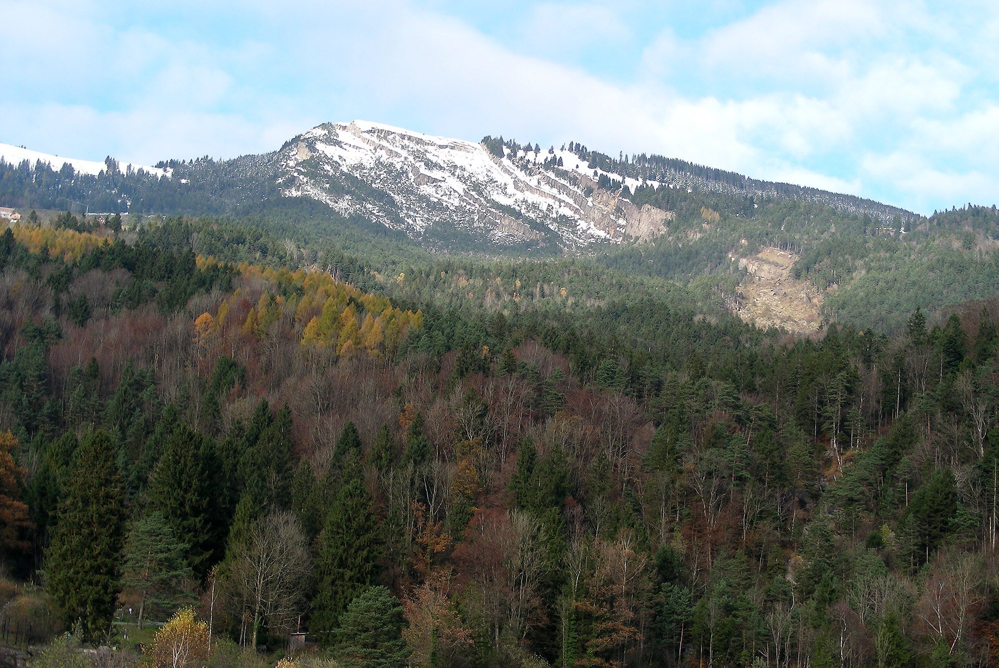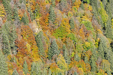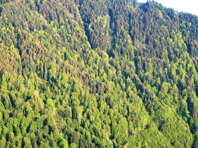 Abb. 1. Ein Steilhang in den Voralpen veranschaulicht die Folgen der Klimaerwärmung für die Waldvegetation. Steigt man in diesem Hang 600 Höhenmeter ab, erfährt man eine Temperaturerhöhung von etwa 3,6 Grad und gelangt dabei von den Nadelwäldern der obermontanen in die Laubwälder der submontanen Stufe. Foto: Peter Brang (WSL)