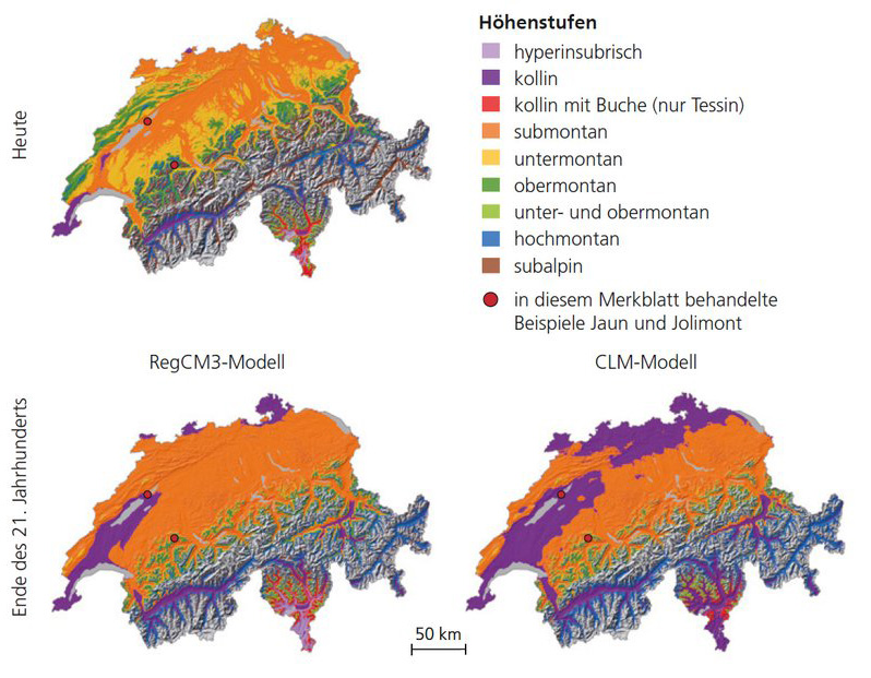 Die kolline Stufe (Abb. 3), in der Trockenheit ertragende Baumarten dominieren, dürfte vorab im Mittelland an Fläche gewinnen. Stark ausdehnen dürfte sich vor allem die submontane Stufe, die bis Ende des Jahrhunderts weit ins Voralpengebiet vorstossen und die Bergketten des Jura fast ganz überspannen könnte. Dafür werden Arealverluste für die untermontane, die obermontane, die hochmontane und die subalpine Stufe erwartet.
