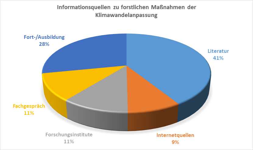 Für alle abgefragten Maßnahmen über alle Gruppen hinweg zeigt sich, dass besonders Literaturquellen (41 %) zur Information genutzt werden. Hier werden primär wissenschaftliche Ausarbeitungen für die Praxis wie Handreichungen (Artensteckbriefe, Waldentwicklungstypen) genannt.