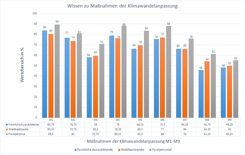 Die neun abgefragten Maßnahmen umfassten jeweils drei waldbauliche (M1, M2, M3), drei praxisbezogene (M4, M5, M6) und drei forstbetriebliche (M7, M8, M9) Maßnahmen.
