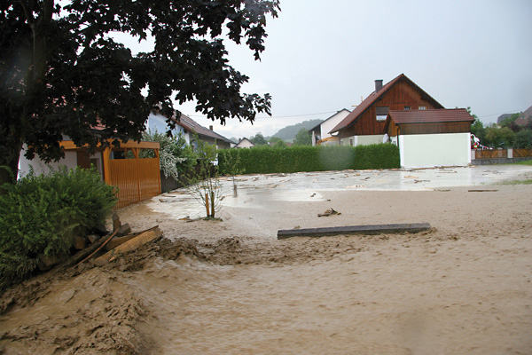 Erste Nachrechnungen von Ereignissen bei Schwertberg in Oberösterreich – hier hatte extremer Oberflächenabfluss im Frühjahr 2016 bei einem Gewitterregen auf einer Fläche von 0,1 km² Überflutungen ausgelöst (Abbildung 1) – zeigen, dass bei entsprechend mächtigeren Niederschlagszellen das Ausmaß der betroffenen Flächen und die Überflutungshöhe künftig deutlich zunehmen können.