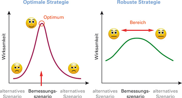 Eine optimal dimensionierte Maßnahme wirkt im Hinblick auf das Bemessungsszenario, hat jedoch möglicherweise eine reduzierte oder keine Wirkung für andere Szenarien. Daher werden nachhaltige und robuste Schutzmaßnahmen benötigt, die auch bei überraschenden und unerwarteten Situationen noch eine bestimmte Schutzwirkung aufweisen (Abbildung 2).