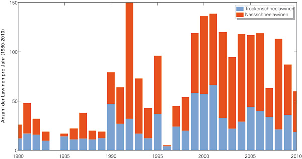 Lawinenexperten haben in den letzten Jahren beobachtet, dass die Anzahl der Nassschneelawinen gestiegen ist (Abbildung 1). Unter anderem im ACRP-Projekt RIMES hat das BFW die Auswirkungen des Klimawandels auf die Lawinenaktivität untersucht.
