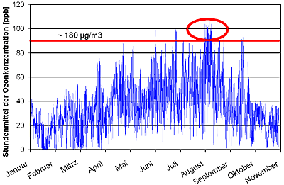 Für hohe Ozonkonzentrationen müssen folgende Voraussetzungen erfüllt sein: Das Vorhandensein der Vorläuferstoffe NOx und NMVOC (flüchtige organische Verbindungen ohne Methan), eine intensive Sonnenstrahlung und eine mehrere Tage andauernde stabile Schönwetterperiode, die zu einer Speicherung von Ozon innerhalb der atmosphärischen Mischungsschicht führt. Besonders hohe Ozonwerte wurden während der anhaltenden Hitzewelle im August 2003 gemessen. Eine solche Witterungssituation wurde das letzte Mal im warmen Jahr 1990 beobachtet, demnach war der Sommer 2003 auch in dieser Hinsicht außergewöhnlich.