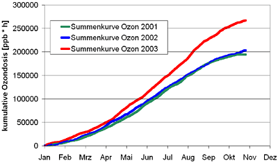 Abb. 2: Summenkurven der Ozonkonzentration der Jahre 2001-2003, Kranzberger Forst, Freising.